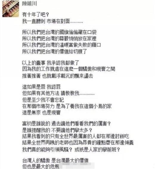 截图中张惠妹的经纪人发文写道:“有十年了吧?我一直听到,市场在对面……所以我们把台湾的国旗偷偷藏在口袋,所以我们把台湾的尊严悄悄放在家里……”