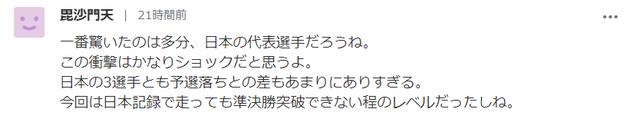 最惊讶的应该是日本的代表选手吧,这个冲击应该十分震惊。日本的3名选手全部在预选赛的时候落选了,这个差异也太明显了。这次按照日本的记录去跑,也无法突破半决赛。