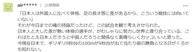 我一直有一个观点,那就是:日本人与外国人相比,体格以及腿长等有差异,不适合这样的竞技比赛。但是看过这个比赛后,让我开始思考。和日本人体格差异不大的选手,埋头苦干的努力,与世界进行竞争。这不论是日本人还是中国都太厉害了,太酷了。现在的日本,费尽全力跑进9秒大关,或许在未来9秒论胜负的时代会到来。