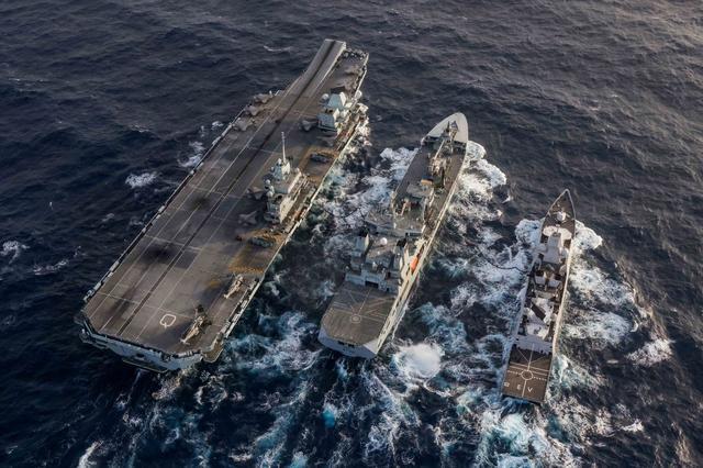 原来英国的“伊丽莎白女王”号航母战斗群,是三个国家拼凑起来的。一艘45型驱逐舰“卫士”号、两艘23型护卫舰“诺森伯兰”号和“肯特”号,一艘机敏级核潜艇以及两艘英国皇家海军的辅助舰船,此外英国航母编队里还包括一艘美国海军驱逐舰和一艘荷兰护卫舰。而部署在“伊丽莎白女王”号航母上的有8架英国皇家空军的F-35B战斗机和10架美国海军陆战队第211攻击战斗中队的F-35B战斗机。由于“日不落帝国”已经衰落,不得不凑了美国与荷兰的驱逐舰与护卫舰,才完成了航母战斗群的标准配置。“伊丽莎白女王”号航母之上,也有10架美国海军陆战队的F-35B战斗机。当然,也可以看作是霸权主义“狼群战术”处心积虑的伎俩。