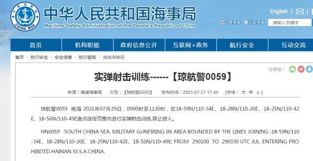 但29日,一场“实弹射击”的演习,正在南海海域进行,清澜海事局公告:7月29日南海部分海域将进行实弹射击训练,禁止驶入。琼航警0059 南海 2021年07月29日,0900时至1130时,在18-59N/110-34E、18-28N/110-26E、18-25N/110-42E、18-56N/110-49E诸点连线范围内进行实弹射击训练,禁止驶入。