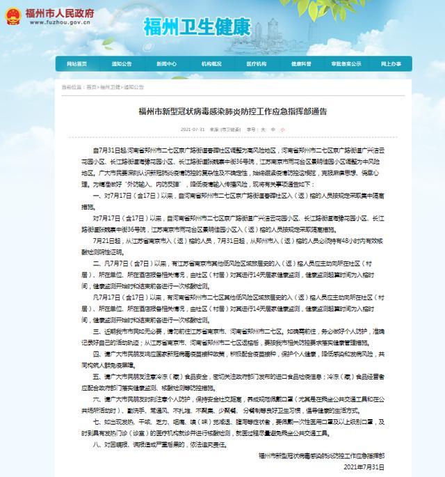 7月21日起,从江苏省南京市入(返)榕的人员,7月31日起,从郑州市入(返)榕的人员必须持有48小时内有效核酸检测阴性证明。