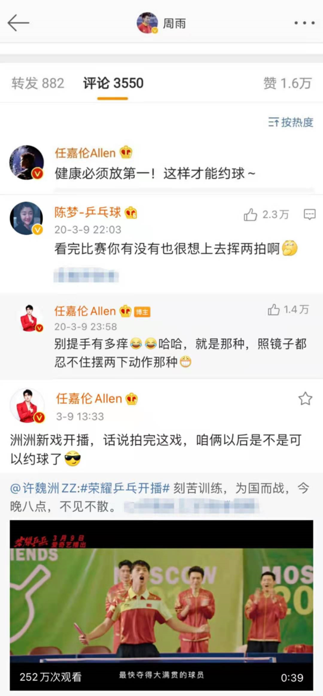 不光是跟老队友互动频繁,每场中国队的乒乓球赛他也必看,还特别爱跟人约球,就连帮好兄弟许魏洲宣传乒乓球主题的新戏也不忘提一嘴。