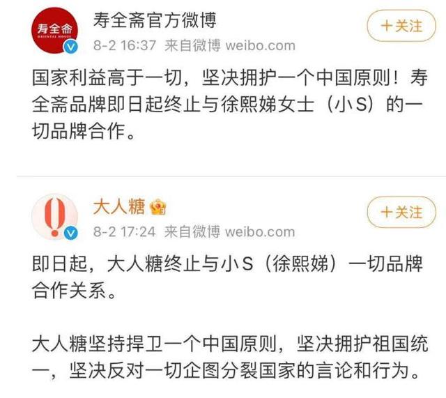 不过,跟之前清扬品牌方相比,「大人糖」跟「寿全斋」这两个品牌方就相对比较霸气一些。他们跟小S的合作还在期限内,但是他们主动官宣跟小S解约了。寿全斋和大人糖等品牌宣布坚决拥护一个中国原则,即日起终止与小S一切品牌合作关系。另据网友爆料,寿全斋已将小S代言画面全部打马赛克。