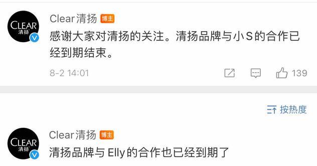 品牌方永远是吃瓜第一人,自从小S被网友爆出这样的事情来之后,他们开始陆续解约。先是品牌方清扬表示与小S还有她的女儿lly的合作已经到期了,所以不会再发布跟小S相关的物料。