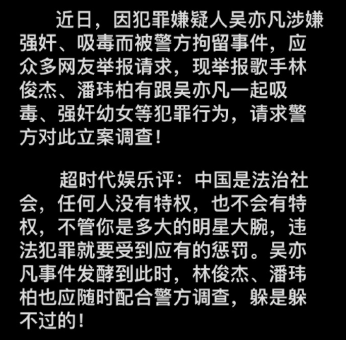 称潘玮柏、林俊杰涉嫌吸毒、强奸幼女等行为,并与吴亦凡是共犯。