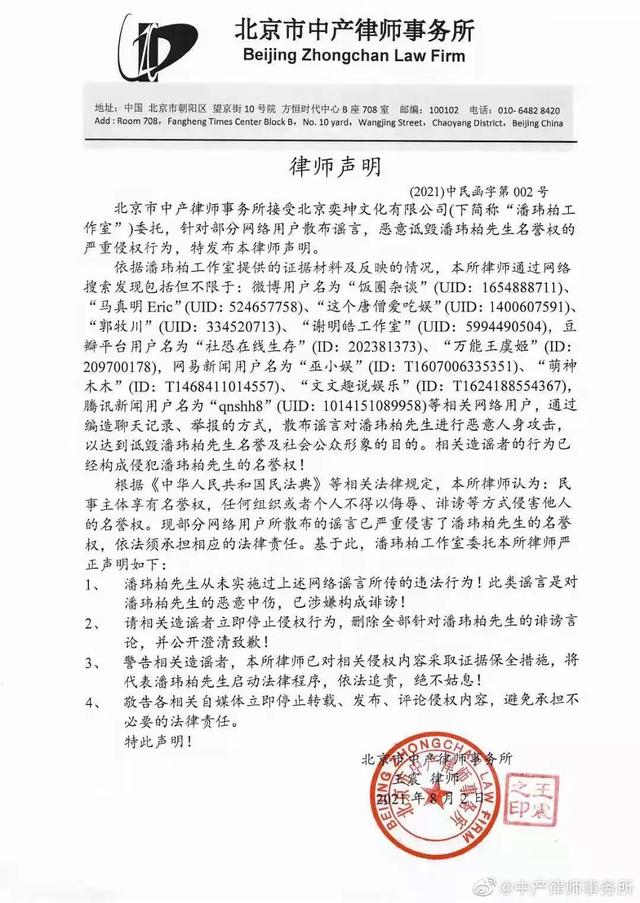 紧接着,8月2日上午10点,潘玮柏工作室发律师声明紧急回应,