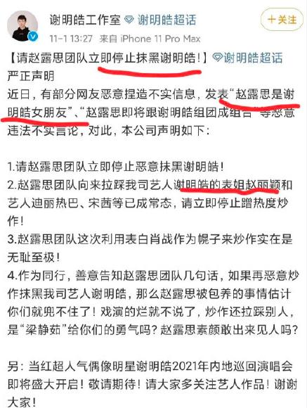 拉踩赵露思,说赵露思团队捏造不实消息发表“赵露思是谢明皓女朋友”;
