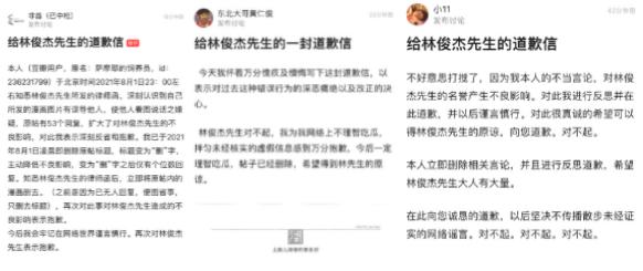 截止目前,已有多名林俊杰公司律师函上出现名字的网友发出道歉信。
