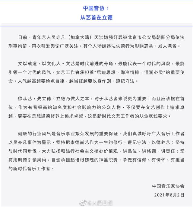 【摘要】 今日,中国影协、中国音协、中国视协就吴亦凡事件发声。中国影协:德不配位的明星如同空中泡沫,飞得再高,膨胀再大,也终会破灭。中国音协