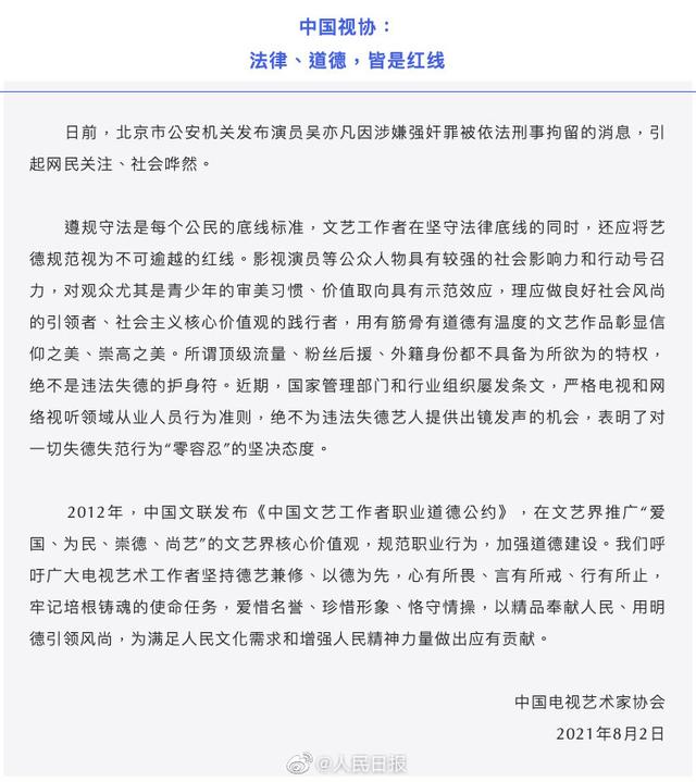 今日,中国影协、中国音协、中国视协就吴亦凡事件发声。中国影协:德不配位的明星如同空中泡沫,飞得再高,膨胀再大,也终会破灭。中国音协:健康的行业风气是音乐事业繁荣发展的重要保证。中国视协:所谓顶级流量、粉丝后援、外籍身份都不具备为所欲为的特权,绝不是违法失德的护身符。