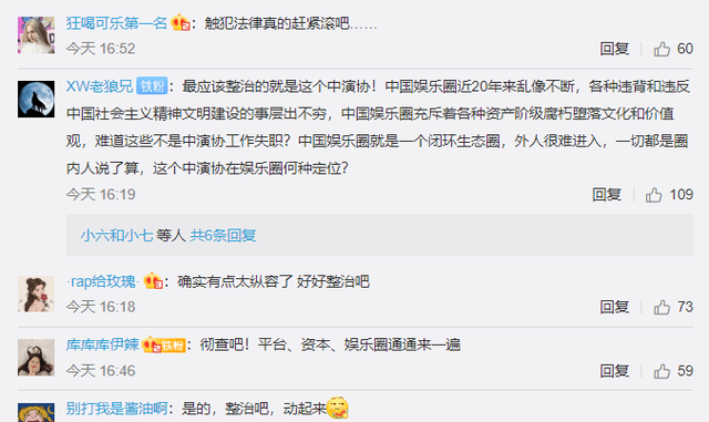 @XW老狼兄:最应该整治的就是这个中演协!中国娱乐圈近20年来乱像不断,各种违背和违反中国社会主义精神文明建设的事层出不穷,中国娱乐圈充斥着各种资产阶级腐朽堕落文化和价值观,难道这些不是中演协工作失职?中国娱乐圈就是一个闭环生态圈,外人很难进入,一切都是圈内人说了算,这个中演协在娱乐圈何种定位?