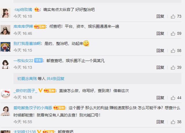网友:@爱吃鲅鱼饺子的小海豚:这个圈子 那么大的利益 赚钱速度那么快 怎么可能干净?想查什么时候都能查!就看有没有人真的去查!别光喊口号!