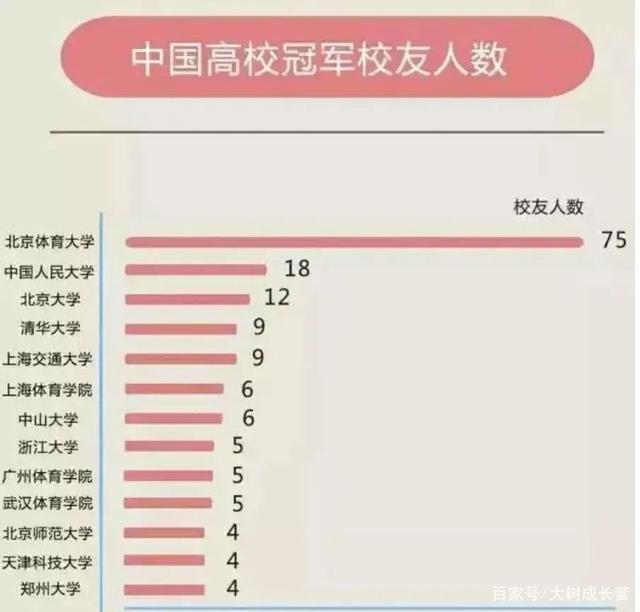 数据统计显示,从1984年的美国洛杉矶奥运会到2016年的巴西里约奥运会,9届奥运会中,中国代表团共夺得227块金牌,产生243位奥运冠军,这些奥运健儿绝大多数都拥有本科及以上学历,近半数拥有研究生学历北京体育大学以校友总数75人遥遥领先,人大以18人排在第二,北大以12人排名第三。