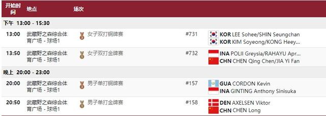 女子双打金牌赛下午12:50(北京时间) 中国陈清晨/贾一凡VS印度尼西亚格雷西娅·波莉/拉哈尤