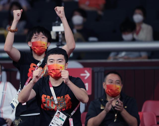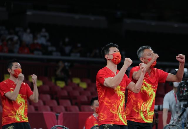 新华社照片,东京,2021年8月2日 (东京奥运会)(6)乒乓球——男团:中国队晋级四强 8月2日,中国队成员为樊振东加油。 当日,在东京奥运会乒乓球男子团体四分之一决赛中,中国队以3比0战胜法国队,晋级四强。 新华社记者 王东震 摄