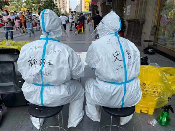 记者注意到,护士们的防护服上都画着笑脸等图案,写着“郑州加油”、“河南加油”等鼓气儿的话。护士小哥告诉记者,在身上写名字一方面可以通过防护服辨别身份,另一方面也是给自己和大家加油鼓劲儿,有些年轻活泼的护士还在自己身上写着“单身”两个大字,把征婚广告打到了自己身上。但也正是在这种艰苦的环境下,这群女孩儿冲上前线,脏活累活抢着干,用自己年轻的身体为郑州构筑起一道美丽的防疫屏障。