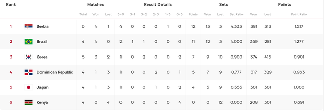 A组赛程暂未打完,塞尔维亚和巴西确定是小组前二;只是巴西队末轮对战实力较弱的肯尼亚,取胜就是A组头名。现在意大利可能是小组第三,巴西队显然不愿成为小组第二,必然全力以赴拿下肯尼亚女排。