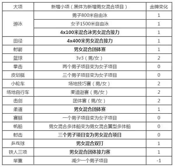 - 增加了很多新的项目,例如,滑板、冲浪、攀岩以及团体性的项目,还有一些小项目,也就是说这届奥运会金牌总数也更多了。