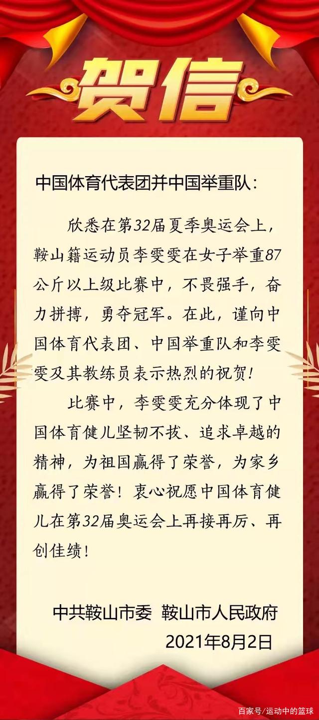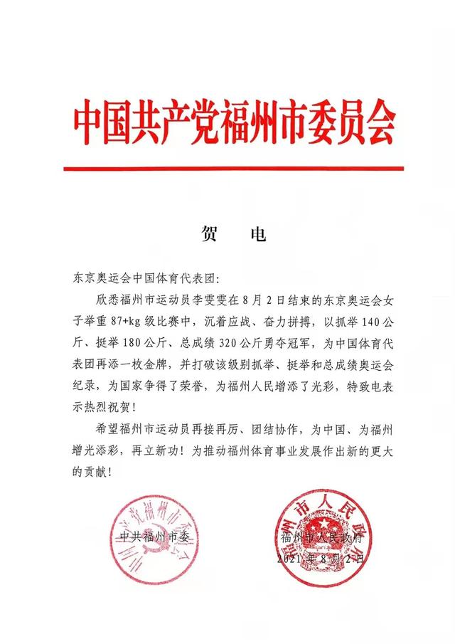 比赛结束后,最高兴的两个地方政府向代表团发来贺电,一个是福州一个是鞍山。
