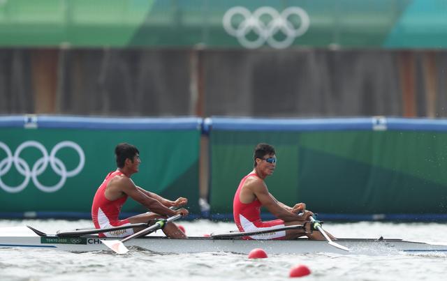 7月28日,刘治宇(左)/张亮在比赛中。当日,在东京奥运会赛艇项目男子双人双桨决赛中,中国组合刘治宇/张亮获得铜牌。新华社记者杜潇逸摄