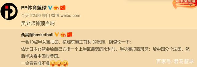 其实早在抽签仪式开始前,著名篮球记者吴頔就通过个人社交媒体对抽签结果进行了大胆预测。“一会10点半女篮抽签,按照东道主有利的原则,阴谋论一下:估计日本女篮会给自己安排一个上半区最弱的比利时,半决赛打西班牙;给中国分个法国,然后半决赛中国对美国。一会看看准不准。”