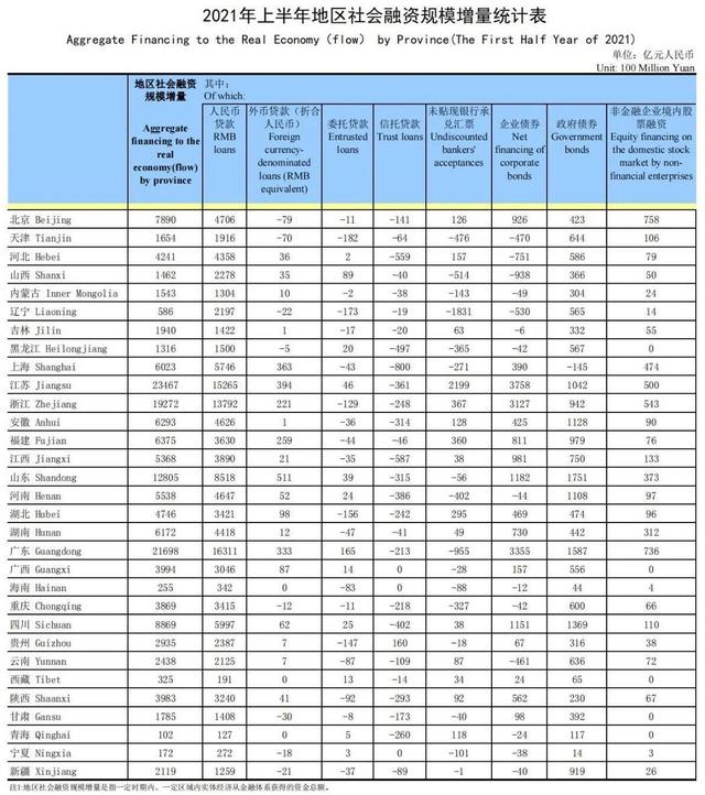 央行网站2日公布2021年上半年地区社会融资规模增量统计表显示,江苏、广东、浙江居前三甲。
