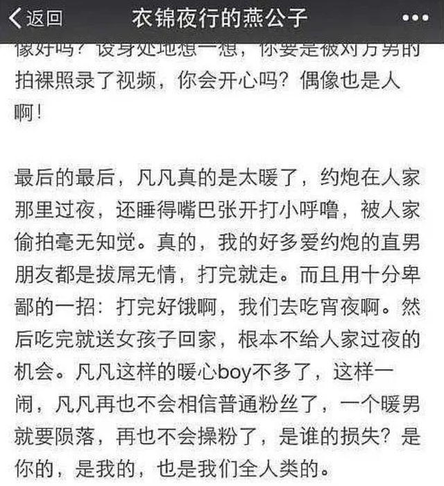 还有业内知名经纪人燕公子,当年觉得吴亦凡约完留宿,简直就是全人类应该珍惜的暖男。