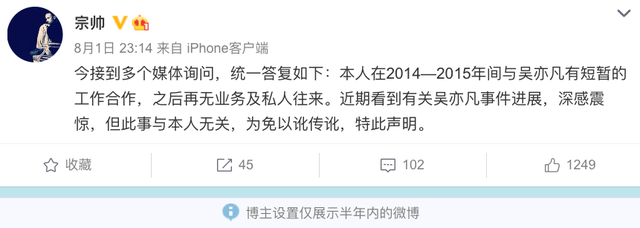 就连6、7年前吴亦凡刚解约回国时的第一位经纪人宗帅,也半夜发声明慌忙撇清。