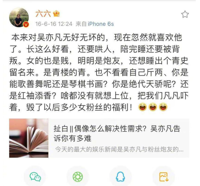 所以,马薇薇和六六的言论很大程度是在侮辱吴亦凡的粉丝、甚至是侮辱女性。不应该被放任,更不能被原谅。