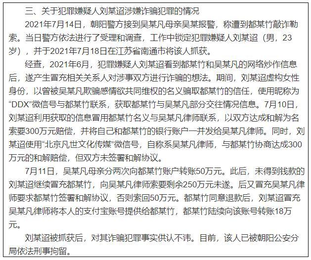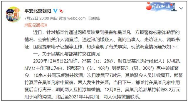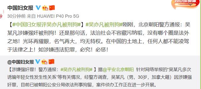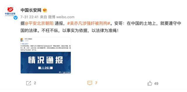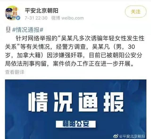 7月31日深夜,北京朝阳警方通报:吴亦凡涉嫌强奸被刑拘!