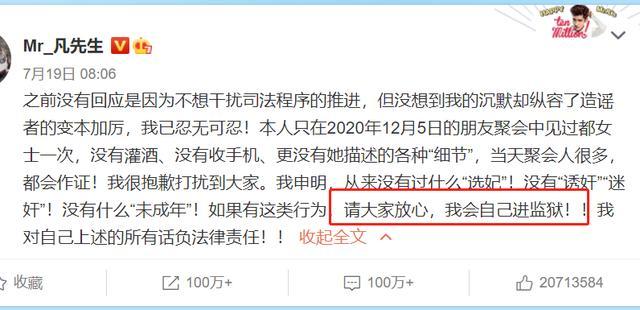 此前,吴亦凡曾发微博回应称,没有“诱奸”、“迷奸”!没有什么“未成年”!如果有这类行为,请大家放心,我会自己进监狱!我对自己上述的所有话负法律责任!