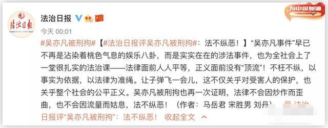 中央政法委旗下法治日报:“吴亦凡事件”早已不再是沾染着桃色气息的娱乐八卦,而是实实在在的涉法事件,也为全社会上了一堂很扎实的法治课——法律面前人人平等,正义面前没有“顶流”!吴亦凡被刑拘也再一次证明,法律不会因炒作而歪曲,也不会因流量而姑息,法不纵恶!
