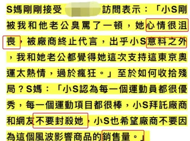 相继四个品牌代言的解约,小S明显慌了。徐妈妈连忙出来转达小S的话,澄清她所认为的误会:“每一个运动员都很优秀,每一个运动项目都很棒,小S拜托厂商和网友不要封杀她,也希望厂家不要因为这个风波,影响到商品的销量。”