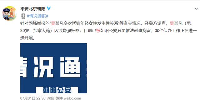 【摘要】 七月的最后一天,继7月22日警方就吴亦凡事件发布通报后,@平安北京朝阳发布情况通报,称经警方调查,吴某凡因涉嫌强奸罪,目前已被朝阳公安