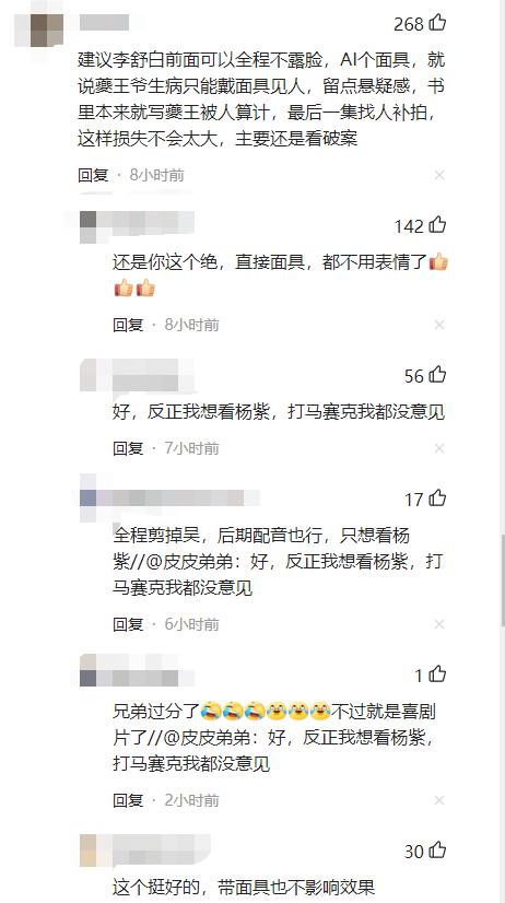 对此,网友们纷纷支招,表示可以全程不露脸,AI一个面具,再配一下音就好。这样的方式挺好的,不用涉及到换人,AI个面具上去,效果做得好一点,也不会太出戏。这样不用看吴亦凡那尴尬的演技,或许会有意想不到的效果也说不定。