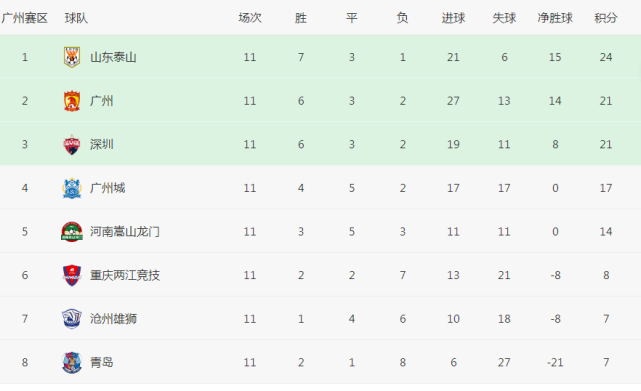北京时间8月2日18:00,2021赛季中超联赛广州赛区第11轮的比赛继续进行,先进行的两场比赛是河南嵩山龙门对阵重庆两江竞技和广州队对阵沧州雄狮,晚上八点另外两场比赛是深圳队对阵广州城和泰山队对阵青岛队的两场德比战。 河南嵩山龙门1-0重庆两江竞技,卡兰加爆射破门,柯钊助攻,完成了对重庆两江竞技的复仇,有望向争冠组发起冲击。广州城5-2大胜沧州雄狮,高拉特上演了帽子戏法,韦世豪梅开二度,沧州雄狮这边臧一峰和谢鹏飞各扳回一球。广东德比战深圳队0-1不敌广州城,广州城完成了复仇,姜积泓打进了必胜球。齐鲁德比战山东泰山队5-0大胜青岛队,段刘愚上演梅开二度,孙准浩打进了本赛季的第二粒进球,德尔加多打进第二粒进球,费莱尼打进第六粒进球,射手榜排在第二位。 本轮比赛结束后,泰山队24分继续领跑积分榜,广州队和深圳队同积21分并列排在第二和第三的位置,广州城17分排在第四,稳坐争冠组,河南嵩山龙门14分,与争冠组仅差一场比赛的胜利,重庆两江竞技排在第六位,积分8分,沧州雄狮和青岛队继续垫底,两队都是7分垫底。