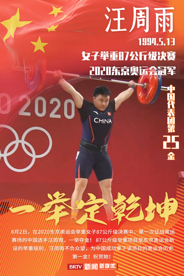 第25金!汪周雨夺女子举重87公斤级奥运冠军