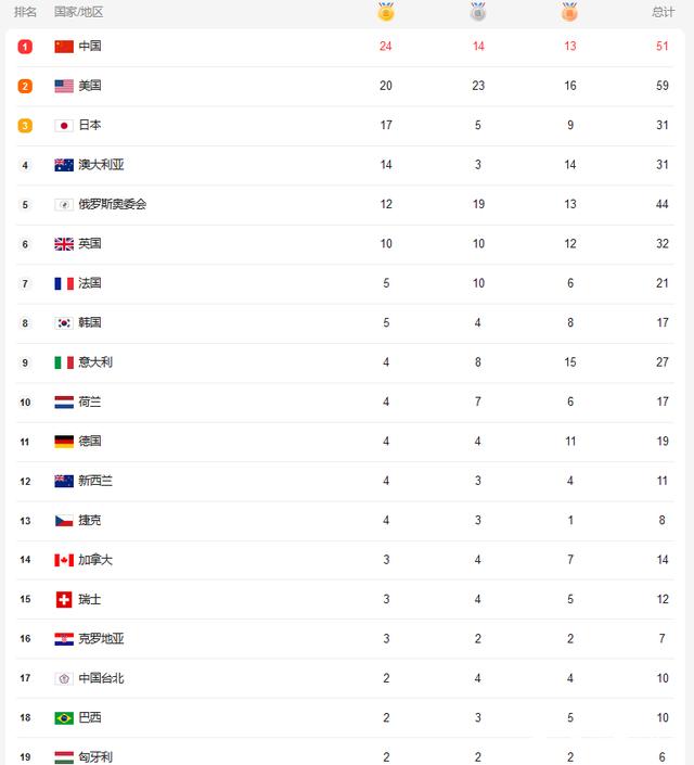 美国倒是收获满满,进入田径和游泳,美国的优势还是很明显,当日美国一共收获4金6银3铜,当日13枚奖牌,这也让它的奖牌总数来到59枚,依旧是各代表队最多的,游泳男子4×100混合泳接力决赛,瑞恩墨菲、迈克尔安德鲁、德雷塞尔和埃波扎克组成的美国队打破世界纪录夺冠,而女子4×100混合泳接力美国也拿了银牌,男子1500米自由泳,芬克再添一金,德雷塞尔当日还拿到了男子50米自由泳的冠军,一日双冠,亚历山大则为美国拿到了一枚高尔夫球金牌。