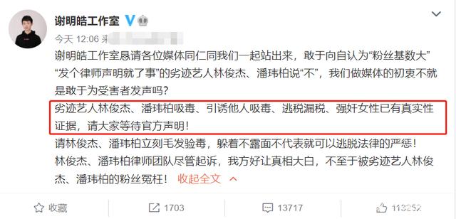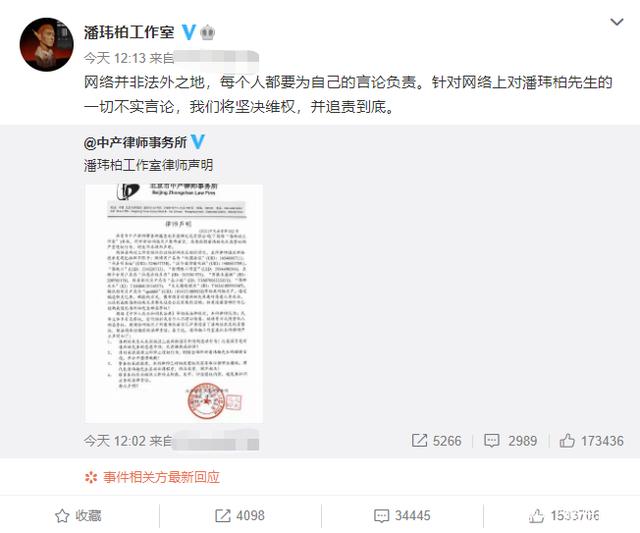 不过,当天十二点,潘玮柏的工作室,就联合自己的律师,发布了一个声明。表示自己一定会维权到底,不会放过每一个造谣的人。如果说潘玮柏是被造谣,那么他的这个声明自然也是强有力的。