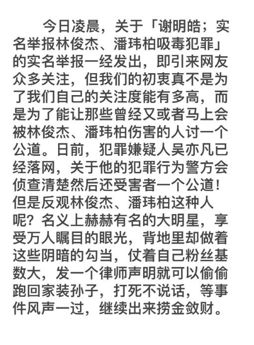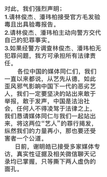 之后,谢明皓更是发表了一份声明,正式举报林俊杰、潘玮柏吸D,并要求他们去做毛发检测,如果林俊杰、潘玮柏没有问题,他愿意承担法律责任。