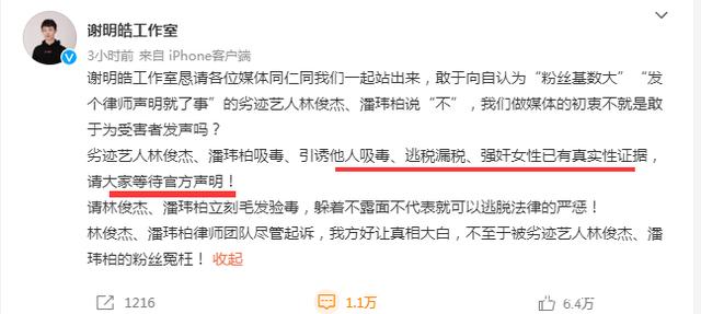 谢明皓声称自己掌握了证据,而且信心十足,潘玮柏已经发了律师声明,网友调侃,现在林俊杰、潘玮柏坐牢,就是你坐牢,结果怎样,我们拭目以待。