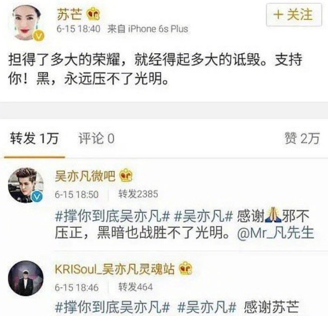 2016年小G娜事件爆发之后,很多圈内人力挺了吴亦凡。