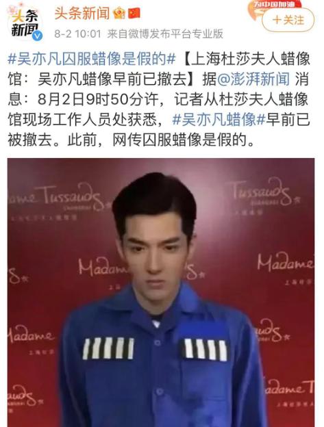 这两天还有人爆料,吴亦凡的蜡像被换上了囚服,虽说后来澄清网图是假的,但吴亦凡的蜡像已经被撤走。