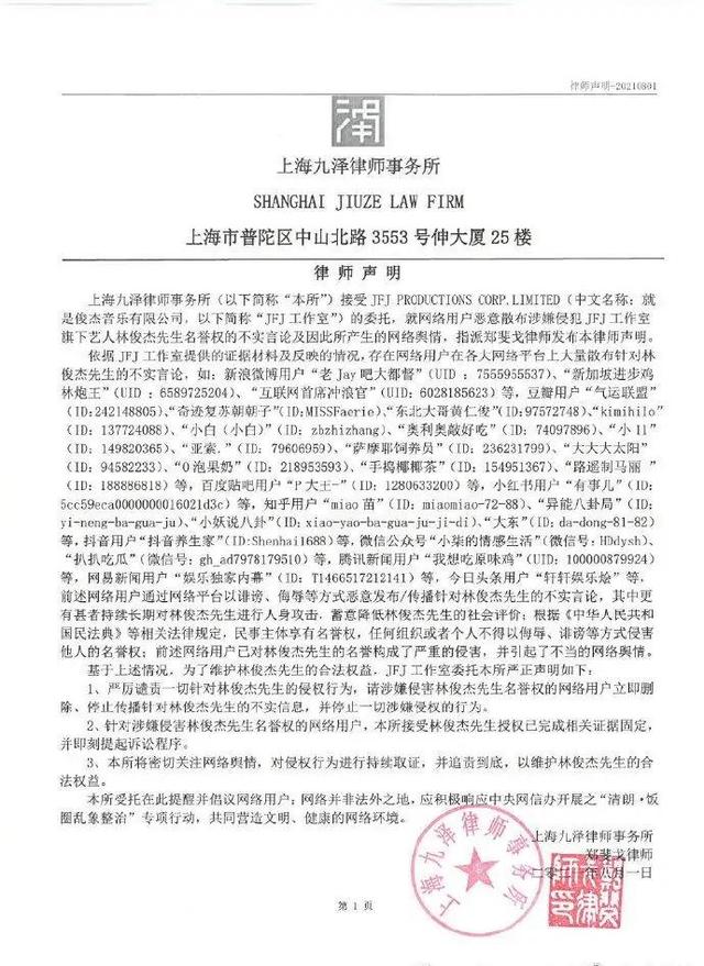 “网络用户以诽谤、侮辱等方式恶意发布/传播关于林俊杰的不实言论,蓄意降低林俊杰先生的社会评价,已对其名誉权造成严重的侵害,并引起了不当的网络舆情,要求相关主体立即停止侵权行为,律所接受林俊杰授权已完成相关证据固定,并即刻提起诉讼。”