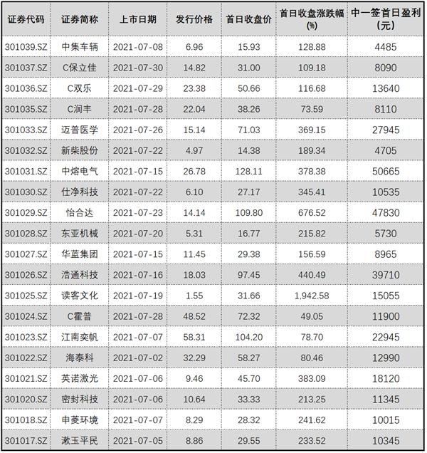 券商中国记者统计了7月上市的20只创业板新股,上市首日的平均涨幅为321.11%。其中,上市首日涨幅最高的为7月19日上市的读客文化(301025),涨幅高达1942.58%,但由于发行价较低的缘故,中一签的盈利仅有15055元;其次是7月23日上市的怡合达(301029),涨幅为676.52%,中一签的盈利(以收盘价算)为47830元。