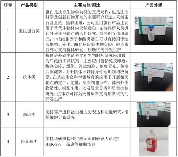 据招股书介绍,义翘神州目前生产和销售的现货产品种类超过4.7万种,其中重组蛋白超过6000种,包括超过3800种人源细胞表达重组蛋白,能够全面满足客户对于最接近人体天然蛋白结构和性质的重组蛋白的需求;公司还能提供约13000种抗体,其中单克隆抗体数量约4600种,能够覆盖生命科学研究的多个领域,为分子生物学、细胞生物学、免疫学、发育生物学、干细胞研究等基础科研方向和创新药物研发提供“一站式”采购生物试剂产品和相关技术服务的渠道。