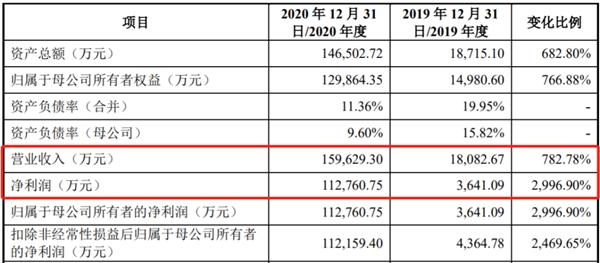 据其招股书披露,新冠疫情以来,义翘神州迅速开发出多种新冠病毒相关重组蛋白、抗体和基因产品,满足下游科研和工业用户在新冠病毒基础研究、疫苗和药物研发、病毒检测过程中对于生物试剂的需求,营业收入和净利润均快速增长。2020年度营业收入为15.96亿元,较2019年增长782.77%,净利润11.28亿元,同比增长超2996%,其中新冠病毒相关产品收入占当期营业收入的比例为84%。