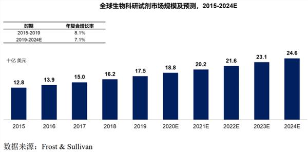 从行业维度来看,义翘神州也处于一个较好的赛道。从全球范围来看,生物科研试剂具有巨大的市场。根据 Frost & Sullivan 数据,全球生物科研试剂市场于2015年达到128亿美元,并以8.1%的年复合增长率增长至2019年的175亿美元,预计到2024年,全球生物科研试剂市场规模将达到246亿美元,2019 至2024年复合增长率为7.1%。