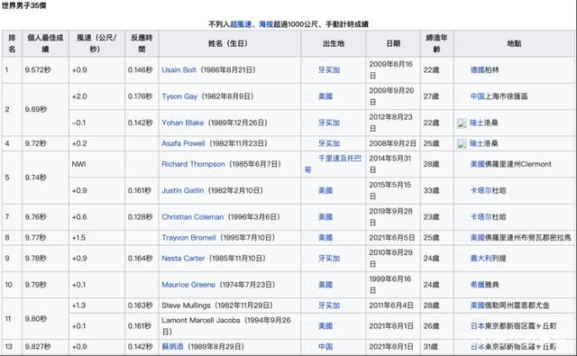 1.在维基百科的世界男子百米记录中,苏炳添的9.827秒排在第13位,前12位都是黑人: